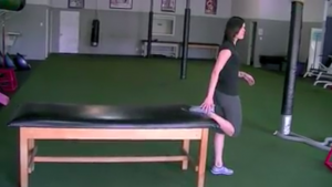 Another stretch that helps the knee is one that focuses on the quad muscles. In the photo above you see our patient using the flat surface to hold their right foot. This could be a table or a sofa at home. Once in position, you will want to slightly bend your left knee to feel that stretch. You can move forward or arch your back if need be.