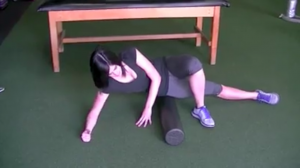 If you have a foam roller, position your lower body on the roller, and cross your leg over. Place that leg firmly on the floor and rock it back and forth. You’ll want to roll through the hamstring and the knee.